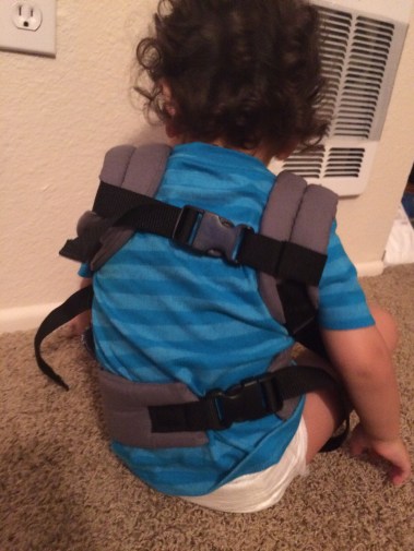 This carrier fit him a bit better. Once again, every strap had to be adjusted to smallest position and the shoulder straps were a bit bulky on him. But the position of the straps cinched around him better and Minion stayed in easier. It was a still not a perfect though, but a bit closer. It would fit much better on a bigger toddler or child who isn’t so lanky. He was very happy, played with his baby on his back for for an hour.