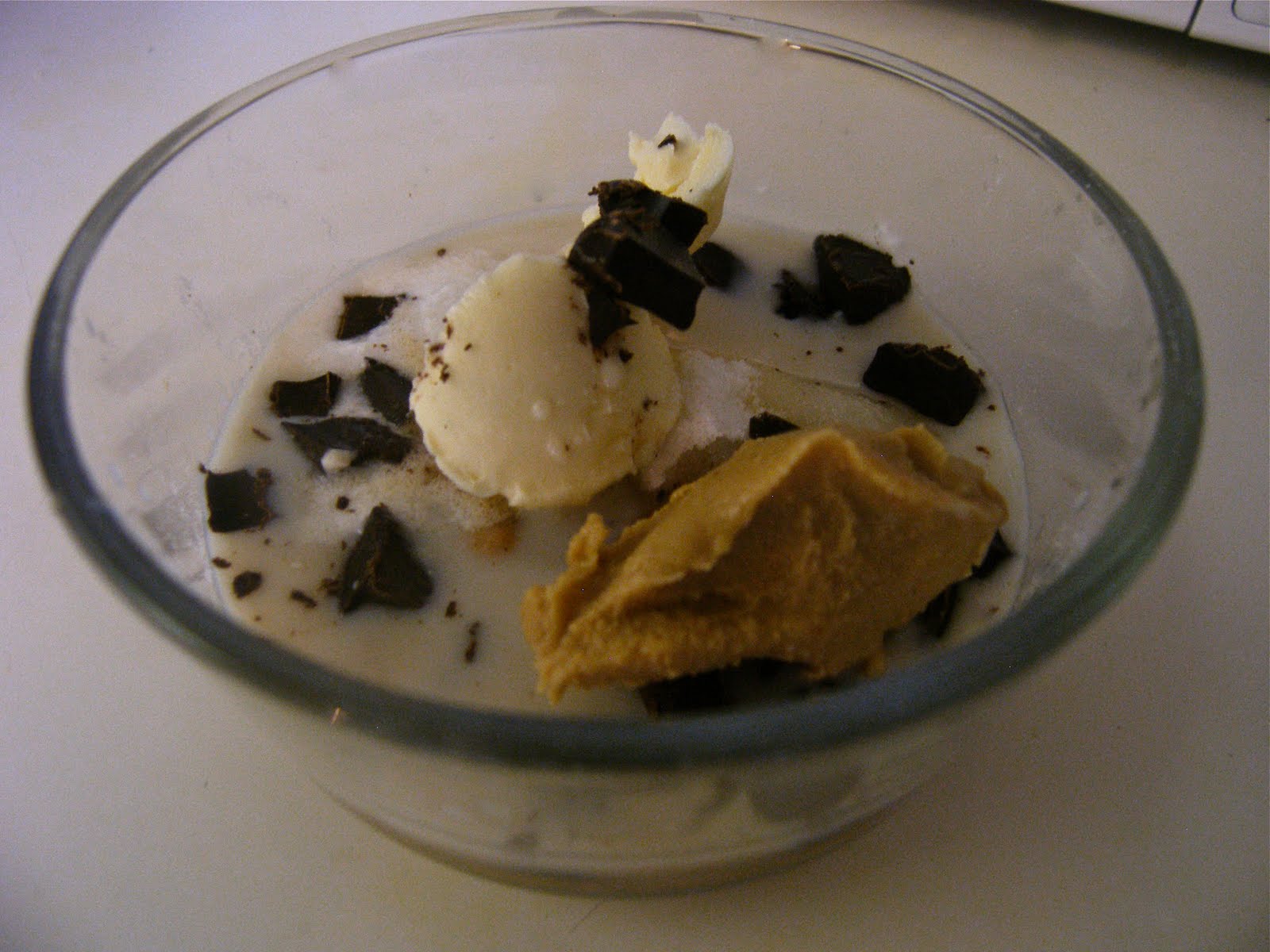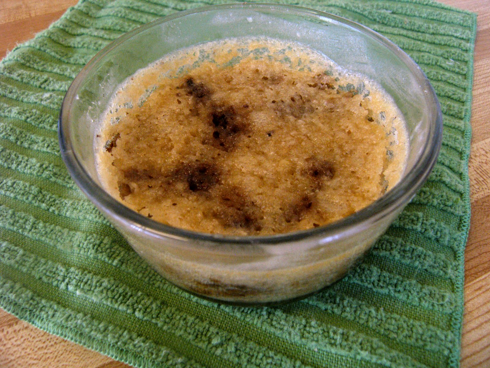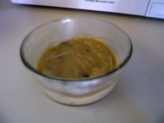 I came back from class today with a sweet tooth. I complained to my friend Amanda that it sucks to make a whole dessert when all you want is one serving. If only there was a way to make a single serving so I am not tempted to eat the whole thing…. Then I remembered a recipe I saw on Veg Web awhile ago, Microwave Brownie for One. Then I remembered I don’t have coco powder and thought my sweet tooth would go unsatisfied. But, a new recipe was posted a few days ago, Microwave Coconut Blondie for One. It is the same basic recipe, just without coco powder and coconut milk instead. I decided to make a chocolate chip blondie based on the two recipes. I threw in some peanut butter for protein too.