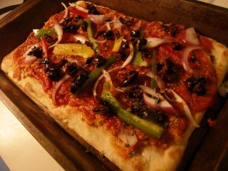 I wanted something different for my Friday night pizza this week, and thought sauce-less might be nice. I saw an amazing spinach pizza recipe when I was looking at other vegan blogs last night…but I can’t remember which one I saw it on. There are great vegan sites out there and one of them has a fantastic spinach pizza recipe that I based this on.