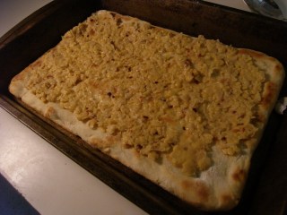 If you use frozen spinach like I did, thaw and thoroughly drain it, or else your pizza will be soggy.  If you are using fresh, wash it well and coarsely chop.