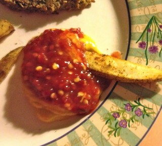 I didn’t have any buns, so I just ate mine plain. But I suggest a nice whole wheat bun, lettuce, tomato, red onion, and a good pickle on the side. I dipped my fries in some mustard and sweet chili sauce mix. If you go for ketchup, get the unsweetened all natural stuff. A lot of the big commercial brands are loaded with sugar and high fructose corn syrup.