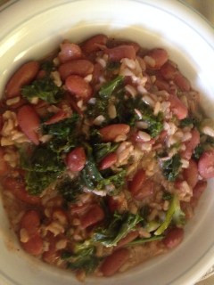 I came up with this one day while Jack was napping and I had a few spare moments to think about dinner. It’s pretty much your standard red beans and rice dish, just with frozen kale instead of bell peppers.