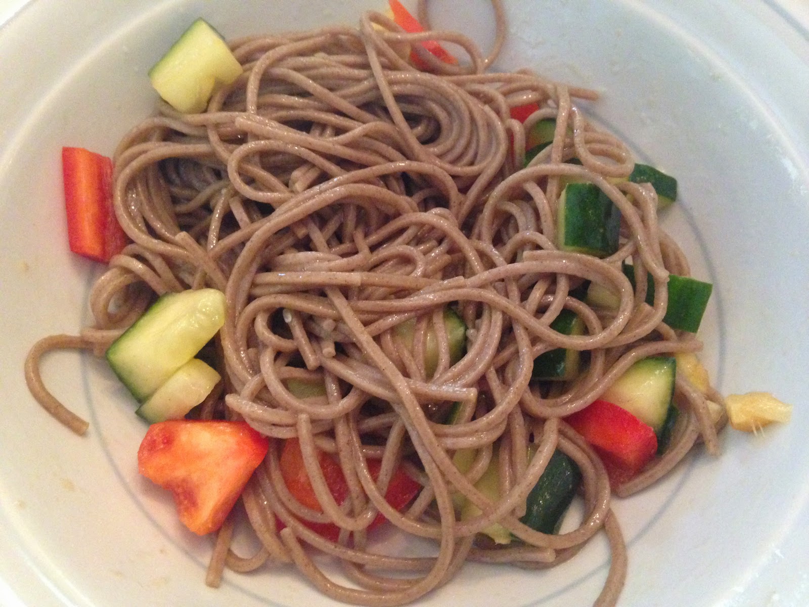 Soba noodles are made from buckwheat, a grain that looks like a seed. It’s also gluten free so soba is great alternative to for those with a gluten allergy. Buckwheat is high in fiber and manganese, and is overall a very nutritious food. Soba noodles can be served cold like in this recipe, or hot like in a soup. I’ve tried them both ways, but I prefer cold.