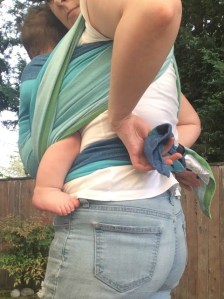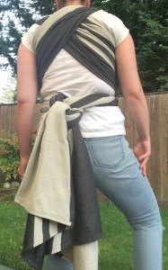 I figured if he wasn’t going to sleep, I would work on some wrap carries. I started to do a Poppin’s Hip Carry, and he was having none Poppin’s Pass tightening. He only seemed happy in a Traditional Sling Carry, but I wanted something more fun. I was messing around the the tail and suddenly remembered the Lexi Twist finish you can do in a Coolest Hip Carry. A few minutes later I had some Sling/Poppins/Lexi hybrid and Bear was sound asleep. Bear’s Sling Carry was born.