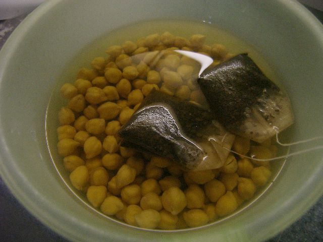 Rinse and pick through the chickpeas. Cover with water and add the tea bag. Soak for at least 6 hours, I left mine overnight.