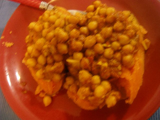 I garnished mine with some more spices. I didn’t feel like waiting for rice to cook, so I threw a sweet potato in the microwave for a minutes and served my pindi chana over it. I loved the orangey-yellow color palate.