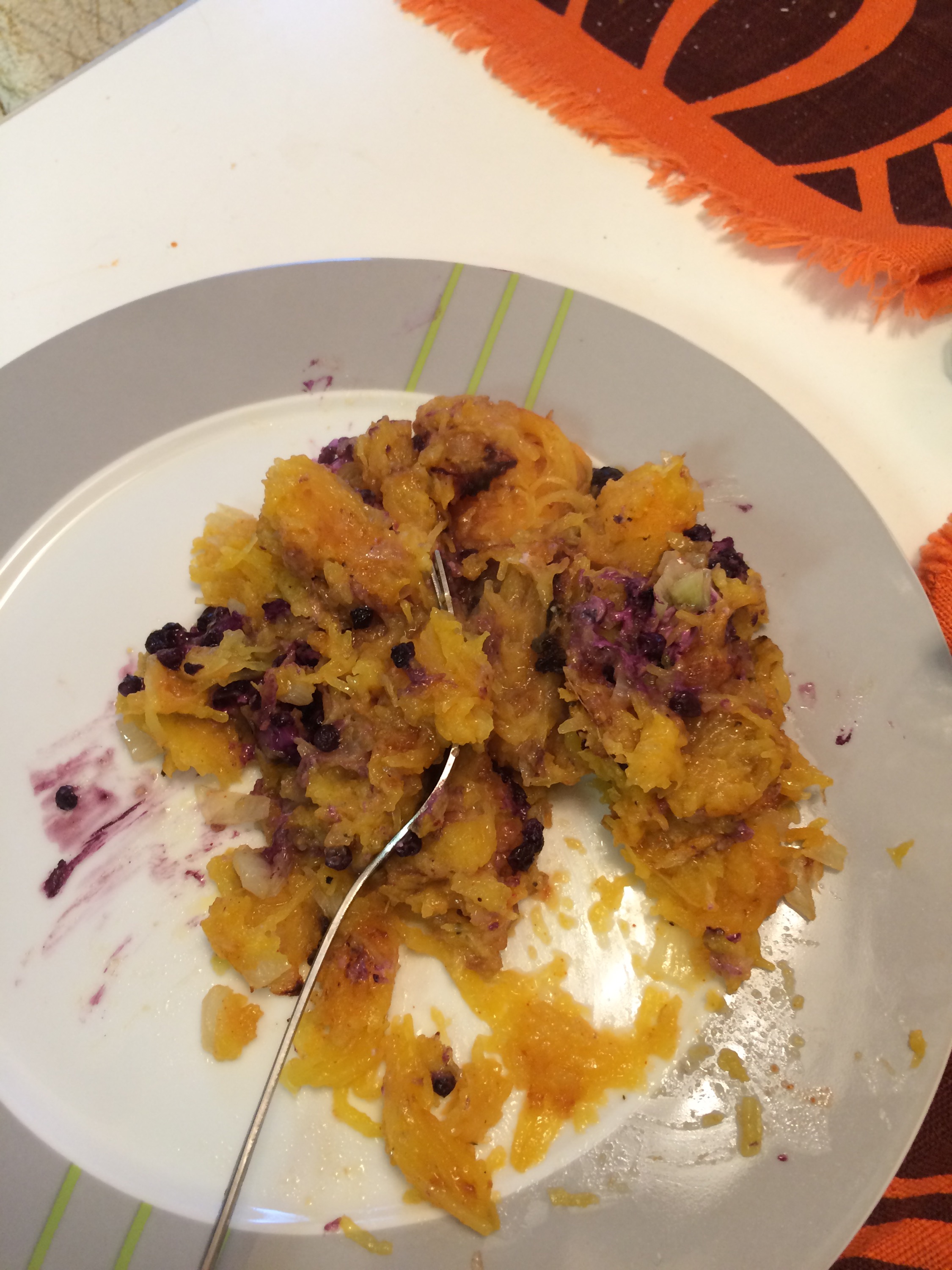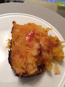 I love most vegetables, but I have never been a big fan of spaghetti squash. It’s just odd, a squash that breaks into little strings? Weird. But I have been looking for more allergy-friendly recipes lately (I am getting really sick of brown rice, beans, and kale all the time). Spaghetti squash as on sale at the store, so I decided to try to veganize a recipe I saw on Pinterest, for hashbrowns.