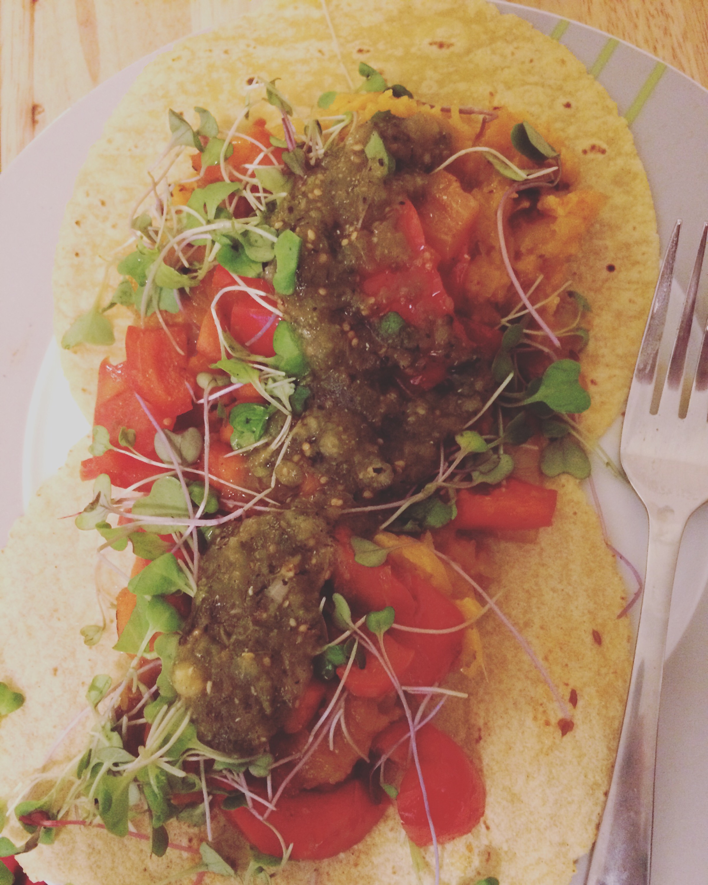 These were the best tacos ever! Just some corn tortillas, scoop of squash hashbrowns salsa, Daiya cheese, micro greens, and hot sauce. Make this, I promise you will not be disappointed!