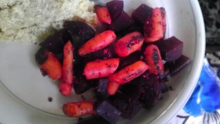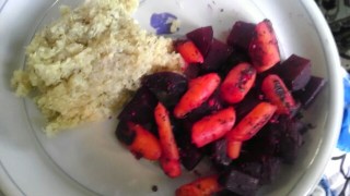 When the beets have 20 minutes left, add the carrots to the oven. When the timer goes the carrots should be golden (it is okay if they are a little black) and soften, and the beets will black on the outside but soft on the inside.