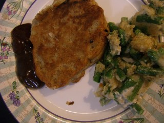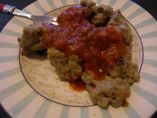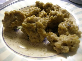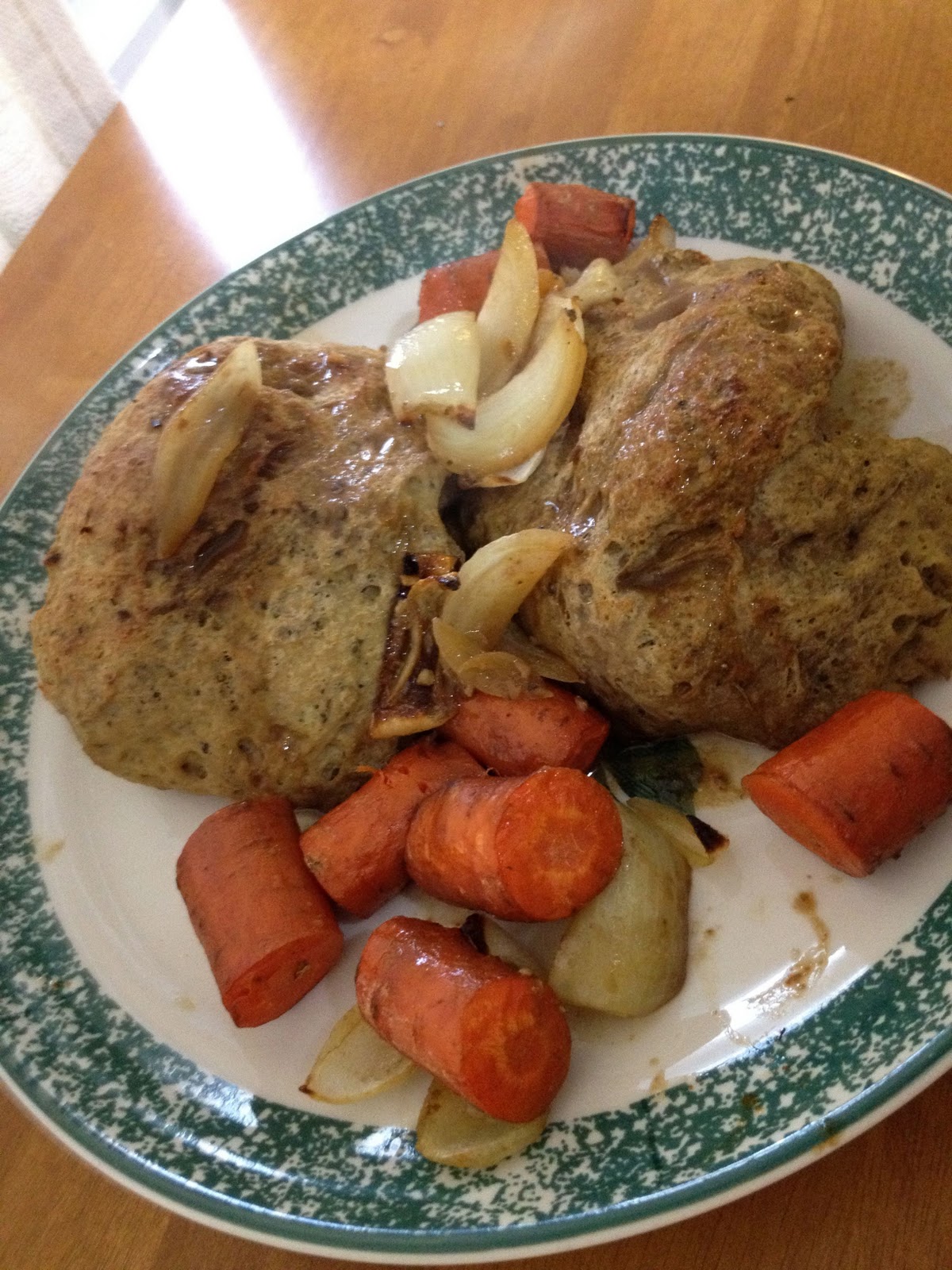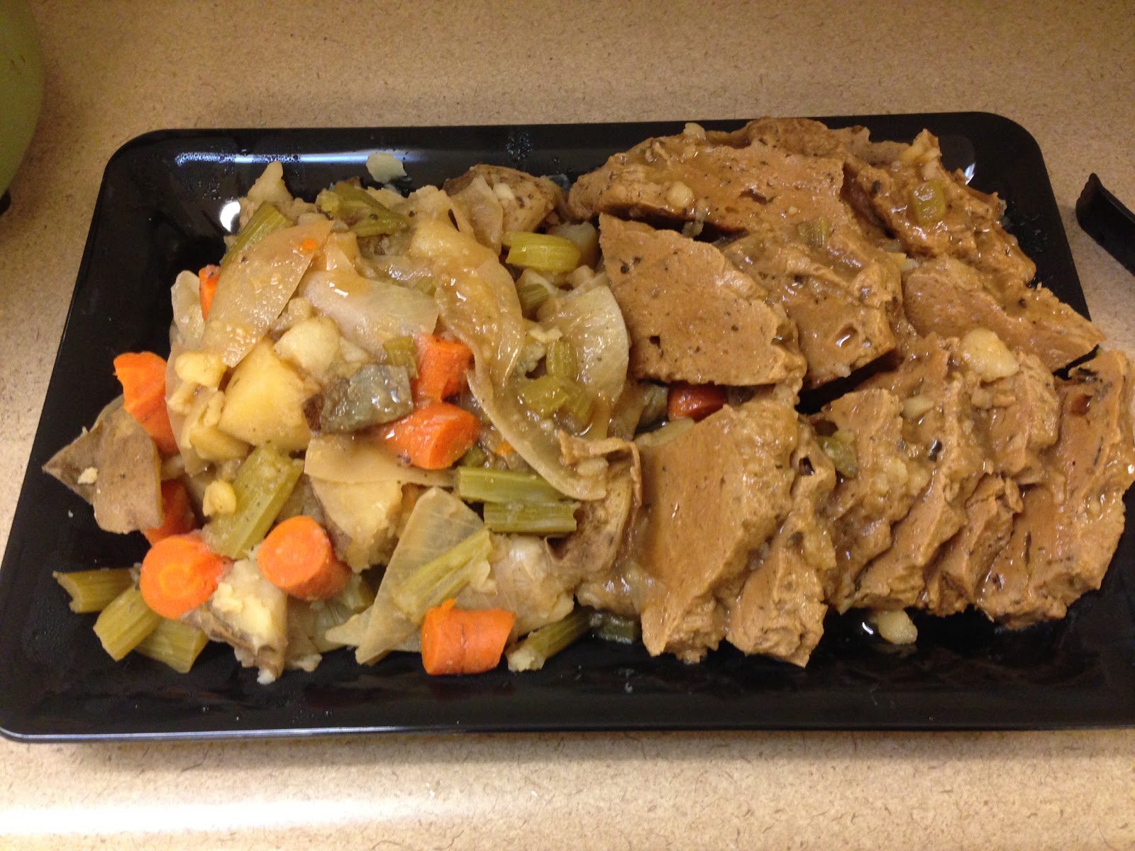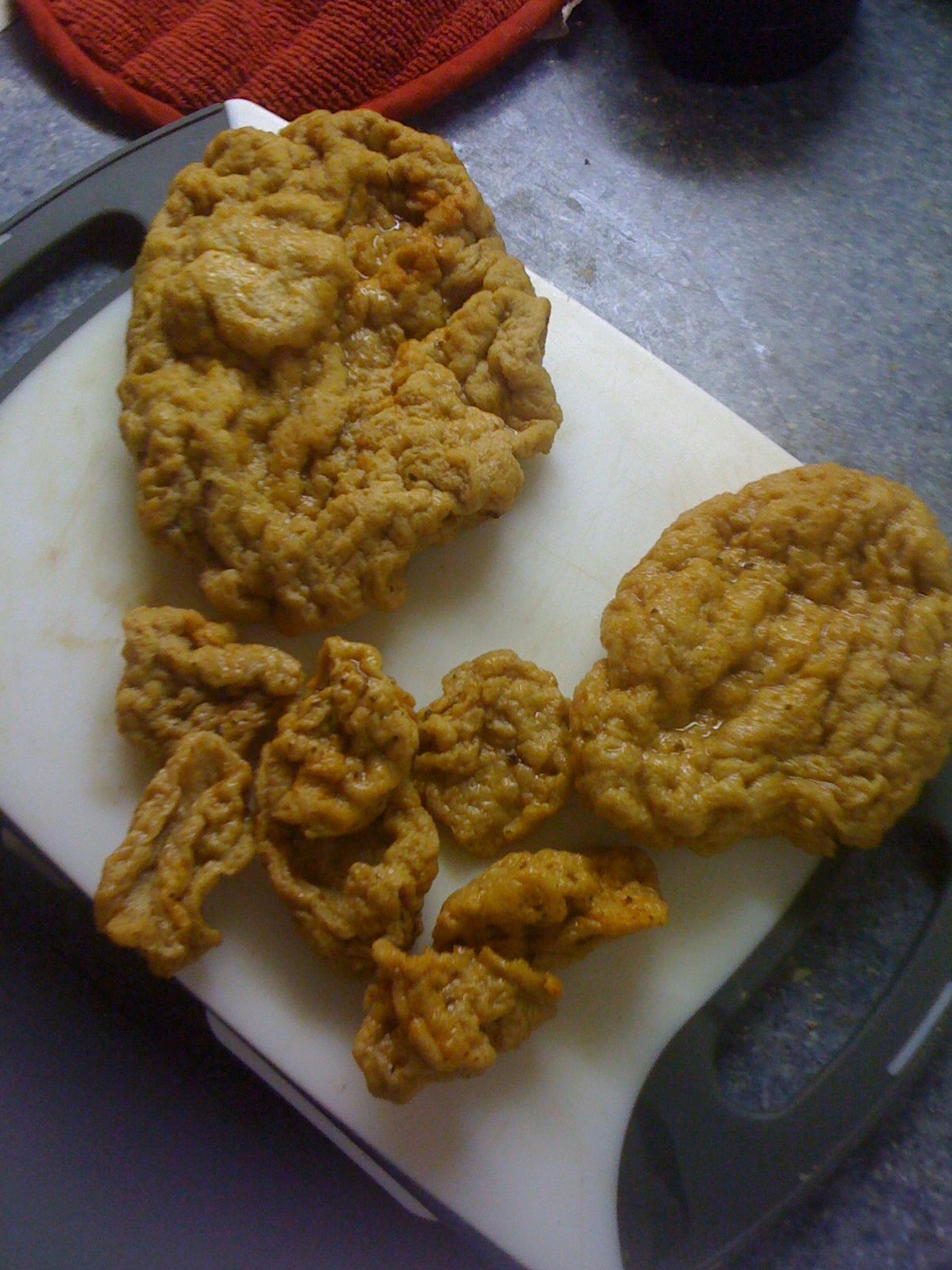 Awhile ago I posted a recipe for homemade seitan where you wash the starch off all purpose flour dough. It makes a very tasty meat substitute, but it is time consuming and annoying to do. There is an easier way to make your own seitan: vital wheat gluten. It is simply gluten flour, flour that already has the starch removed. I have not bought it before because plain flour is usually cheaper. But I found a small box on sale for $2.99 at my local health food store (two hippies got into a fight in the check-out line so I stepped behind to display to get out of their way and noticed the box on the shelf).