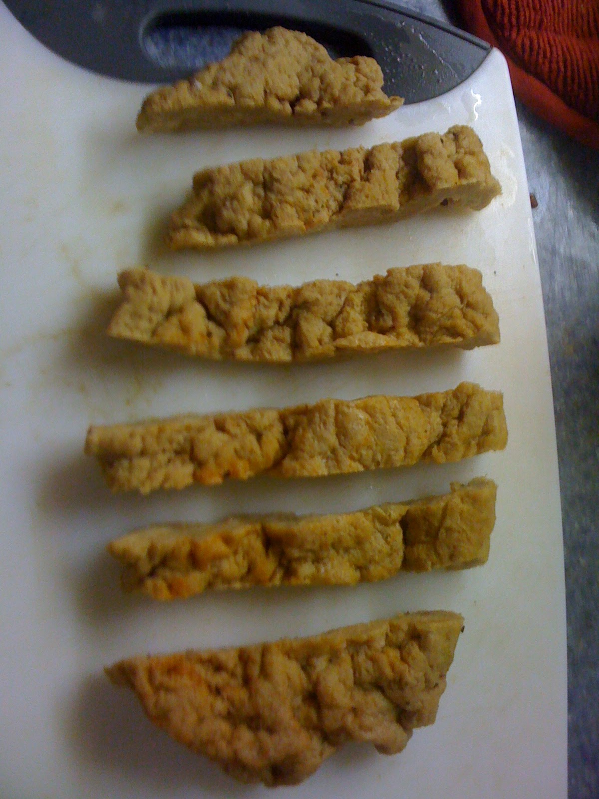 The beauty of vital wheat gluten is there is no washing necessary. Just mix the ingredients, knead lightly, and boil. Takes at least half an hour off the prep time. Awhile ago I saw a blog for BBQ seitan ribs, which I magically cannot find again, so I decided to made a similar recipe.