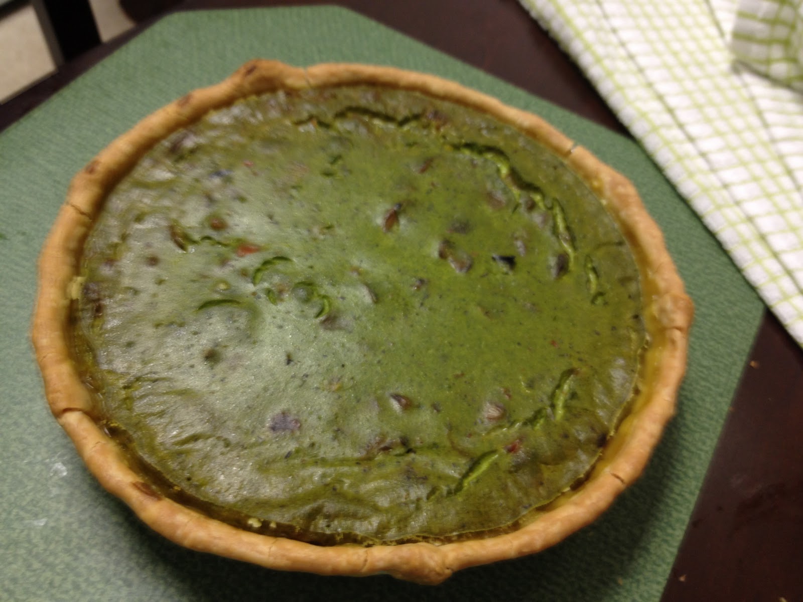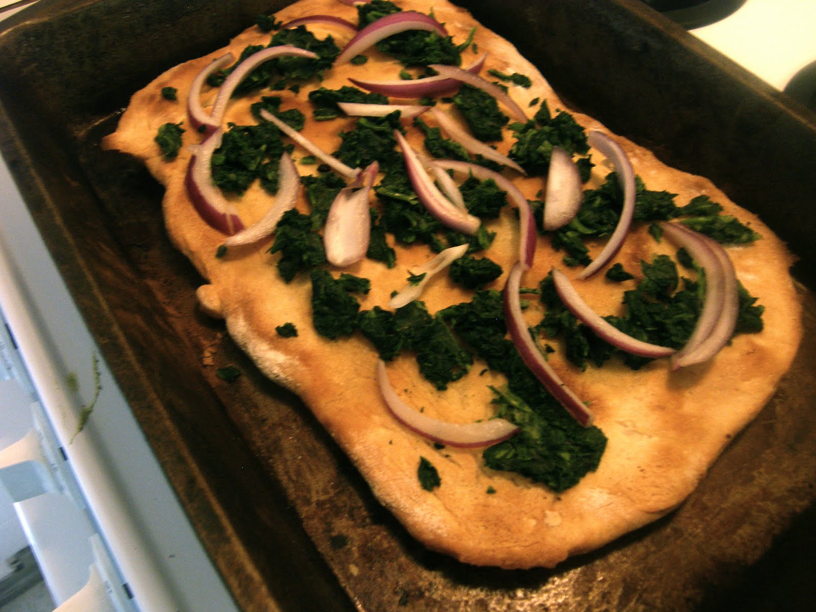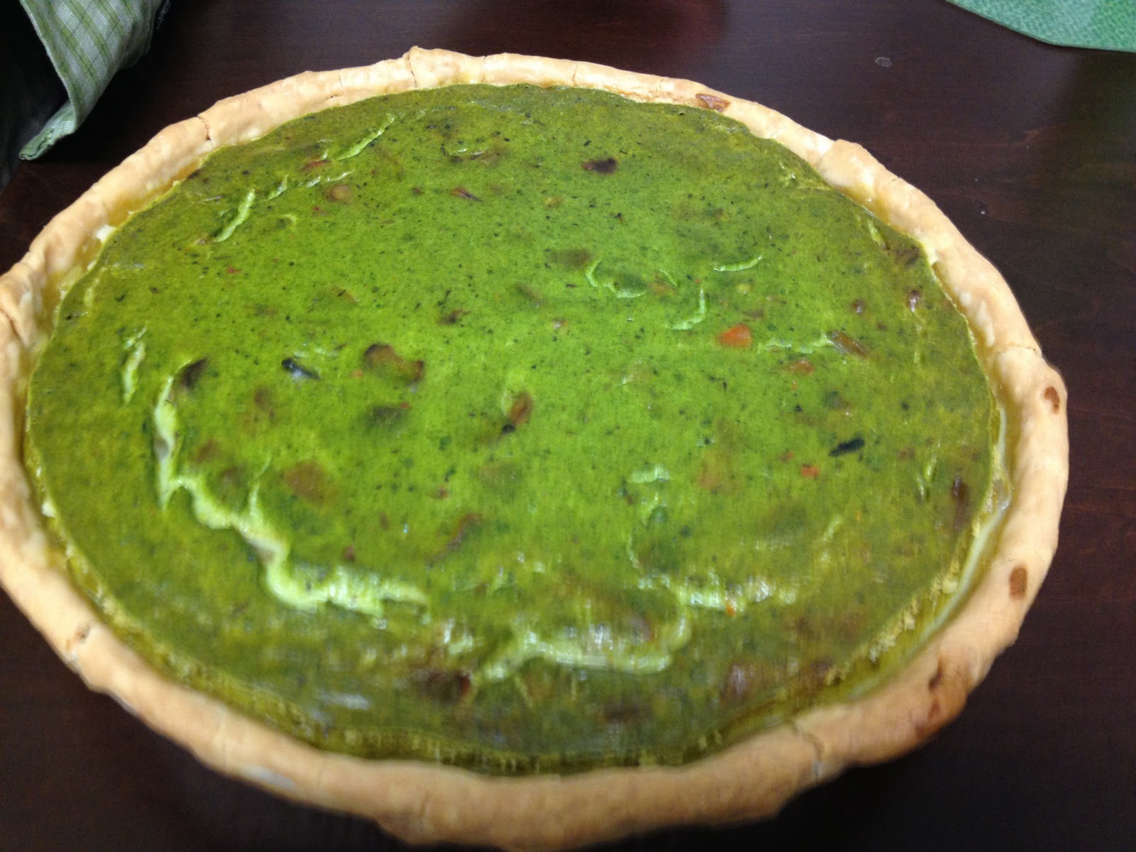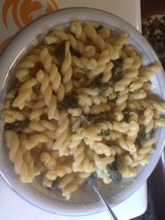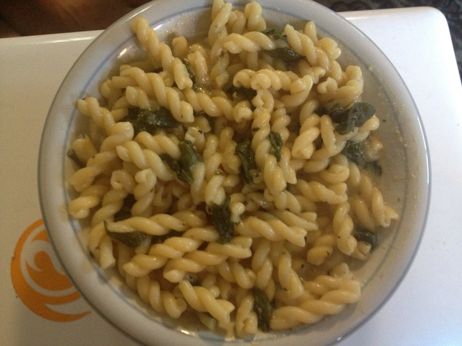 When the pasta has about 5 minutes left, add the spinach and garlic. Mix together well.